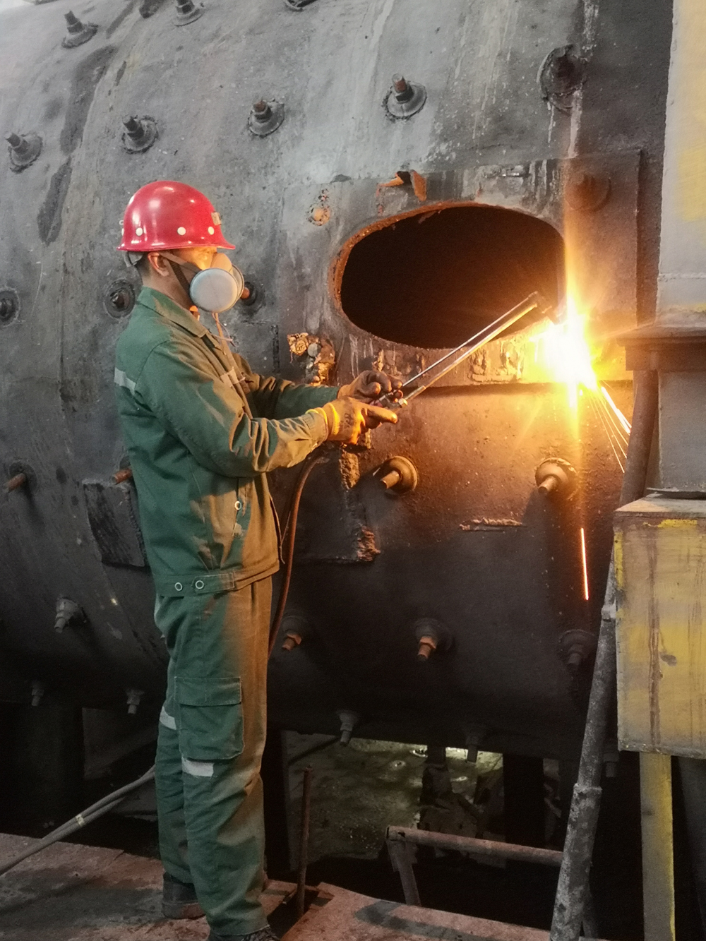 4月6日上午8時,按照計劃安排球磨機鋼球已經(jīng)全部倒出,白班進行舊襯板拆除工作。同時,磨選車間充分利用本次檢修機會,同步工藝停機,對10#球磨機鼓式給料器進行更換、對11#球磨機出料端端蓋進行檢查補焊、對8#球磨機小齒輪軸承座北側(cè)螺栓進行更換。